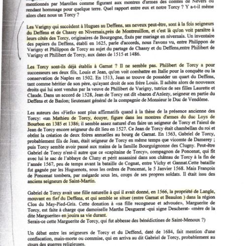 Bien étrange, car nous savons désormais, que le nom même de Torci, n’ apparaitra que bien plus tard par un nom d’homme d’armes, Mathieu de Torci, écuyer, à une « montre » en 1385 et 1386 ( pourquoi deux dates : car à la première, l’équipement n’étant pas conforme, il a dû se représenter l’année suivante ). A Garnat, le nom même de Torci, ne devait pas exister chez nous, en 1160. ( Torcy, actuellement Propriété de Mr Michel Sarton du Jonchay).