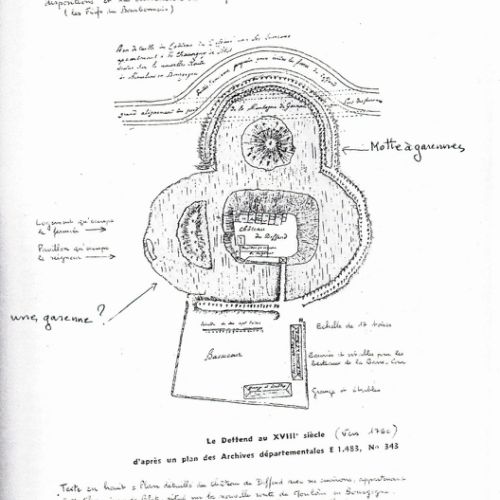 Puis il nous écrit que d’autres noms reflètent la christianisation du Pays au XIème siècle : il relève environ 50 noms de saints en tout, St Germain entre autres et aussi des noms relevant de l’époque féodale ( par leur structure : comme pour notre Deffend ). J’y associe le Castelet du Chambon de l’Epine sur les terres dite « Varenne » proche des Carcoussets. Ce castelet certainement contemporain ou plus ancien que le Deffend.