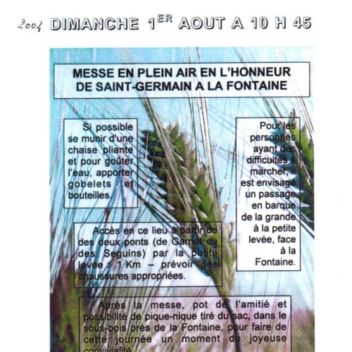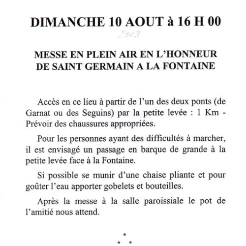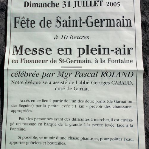 Cette fontaine du Bon St Germain, grâce à l’action et le dévouement de Mr Michel Fallot habitant la Caserne (déformation de caverne ) que j’ai connu à cette époque, sera sorti de son oubli en y faisant , chaque année, pratiquer par Mr Le Curé une messe sur place, très fréquentée grâce au dévouements de nombreux garnatois ( 2003-2005), sans oublier le passeur, Mr Philippe Godiot, qui faisait traverser les participants ainsi que la statue de St Germain ( statue en bois) existant à l’époque et la bannière (double, représentant St Germain et St Roch), sur la grosse barge en fer qui servait d’habitude pour l’entretient du canal, et qui sera toujours utilisée lors de la reconstruction du grand Pont ( départementale 973) sur le canal. ( novembre 2013). Autrefois ceux qui entretenaient les digues et berges, étaient dit « Margotas ».